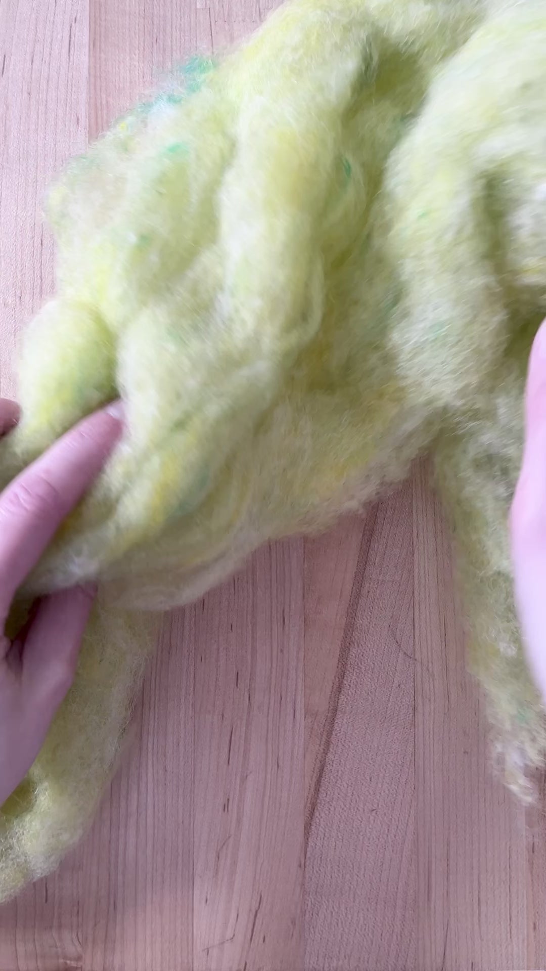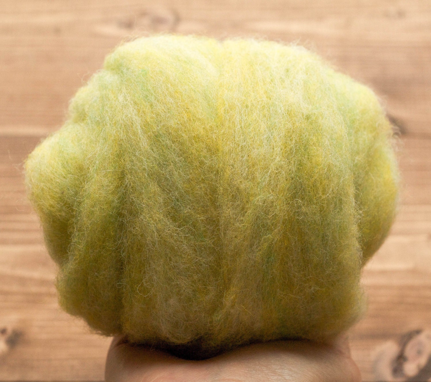 Meet Lemongrass, a summery pastel citron color featuring variegated tints of green, yellow, and white. This is 100% virgin wool. It is very fluffy and soft to the touch, and has a wonderful textural quality with little nubs throughout.