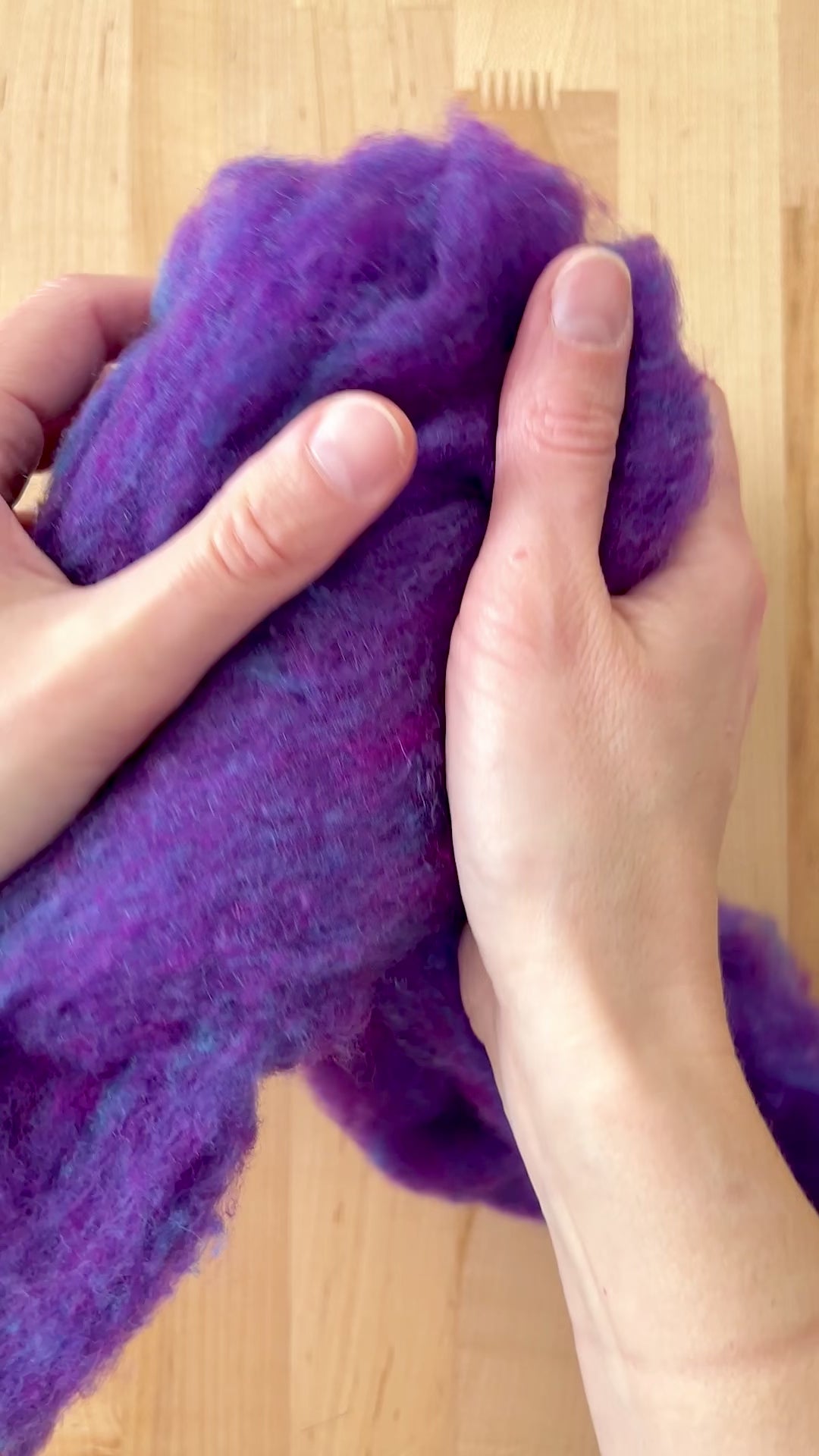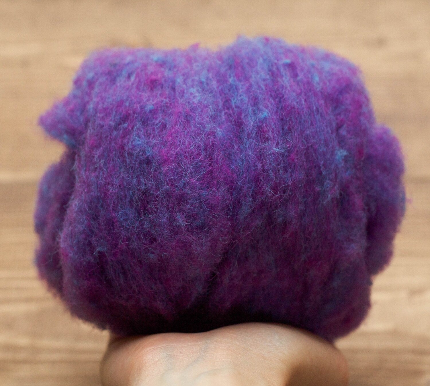 This is 100% virgin wool, and is made up of fleece from several breeds of sheep that combine to create a fluffy and soft batting with a great texture. It can be used for needle felting, wet felting, and it will spin into a lovely textured yarn.