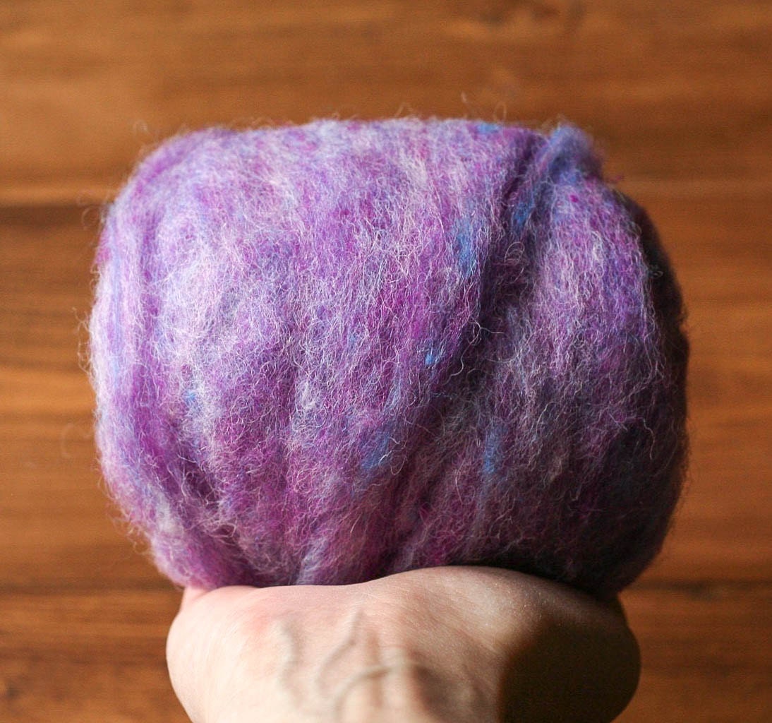 This is 100% virgin wool, and is made up of fleece from several breeds of sheep that combine to create a fluffy and soft batting with a great texture. It can be used for needle felting, wet felting, and it will spin into a lovely textured yarn.