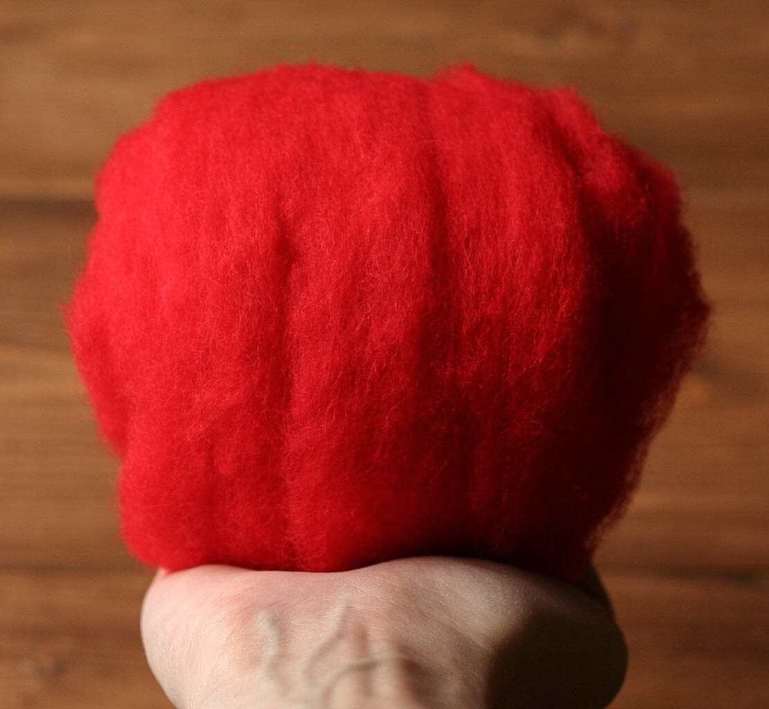 Batts (or batting, or fleece) and roving have both been pulled through carding machines which comb and align the fibers to some degree. But with batting, the wool comes off the machine in thin sheets which are layered to form thicker fluffy sheets. The layering results in a textured wool where the fibers are no longer aligned, making it perfect for needle felting as it felts up very quickly. Roving, on the other hand, is processed one step further and pulled off the machine in ropes where the fibers are mostly aligned. Though the fibers are more aligned, this form of wool still retains the wool's natural crimp, making it another excellent choice for needle felting.