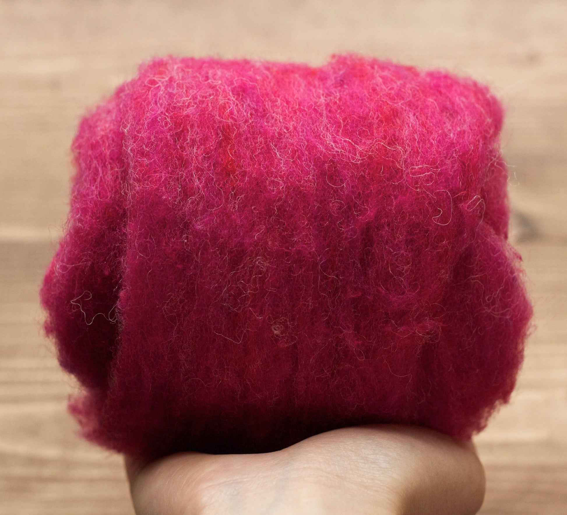 Meet Raspberry, a rich berry color featuring variegated shades of fuchsia, red, and white. This is 100% virgin wool. It is very fluffy and soft to the touch, and has a wonderful textural quality with little nubs throughout.