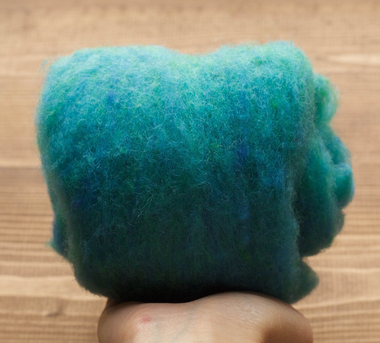 Meet Turquoise, a deep blue-green featuring variegated shades of cobalt, cerulean, and spring green. This is 100% virgin wool. It is very fluffy and soft to the touch, and has a wonderful textural quality with little nubs throughout.